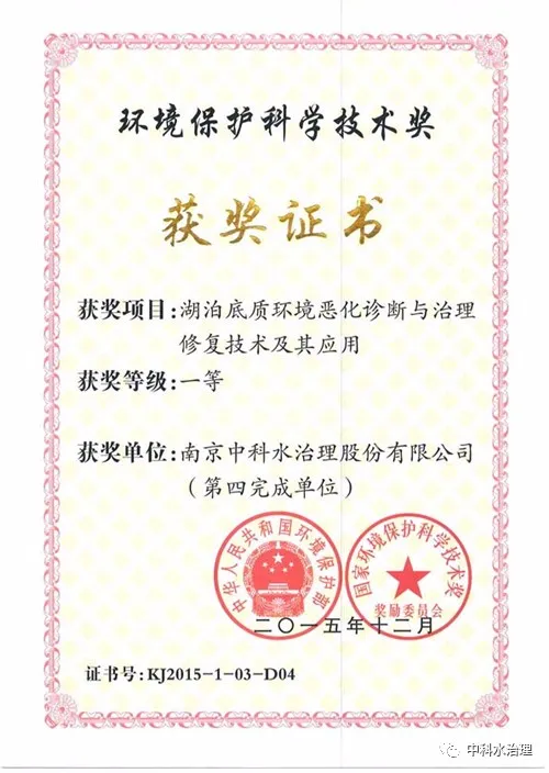 2015年,中科水治理技術(shù)獲得國家環(huán)保部頒發(fā)的環(huán)境保護(hù)科學(xué)技術(shù)一等獎。