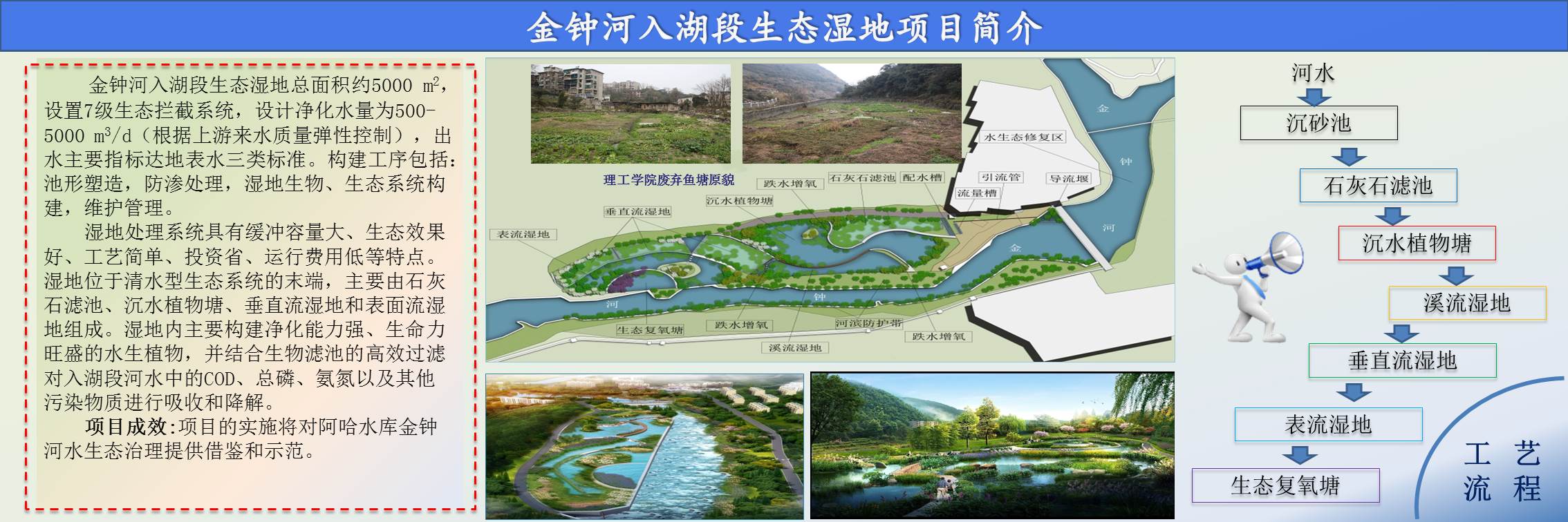 金鐘河入湖段生態(tài)濕地是中科水治理在生態(tài)濕地領(lǐng)域的一大突破,濕地主要由石灰石濾池、沉水植物塘、垂直流濕地和表面流濕地組成,設(shè)計凈化水量為500-5000m3/d,根據(jù)上游來水質(zhì)量,通過引流裝置彈性控制入水量。設(shè)置的7級生態(tài)攔截系統(tǒng),凈化水質(zhì),確保出水主要指標達地表水環(huán)境質(zhì)量標準(GB3838-2002)Ⅲ類水標準。