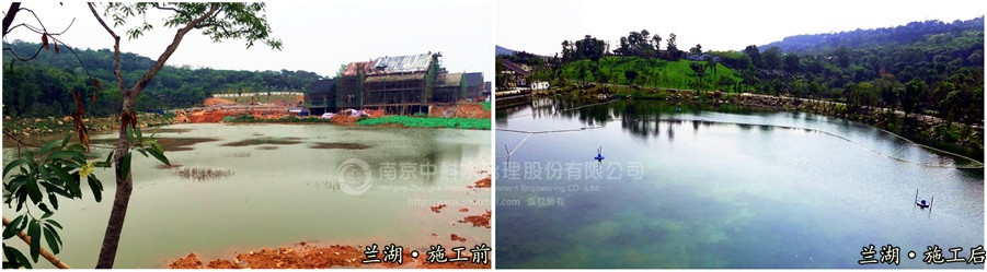 蘭湖屬于原有池塘改造,水域面積16000m2,水深1.2-3m之間,施工后,水體清澈見底,沉水植物生長(zhǎng)旺盛,覆蓋率達(dá)到75%以上,各項(xiàng)水質(zhì)指標(biāo)均達(dá)到Ⅲ類水標(biāo)準(zhǔn)。